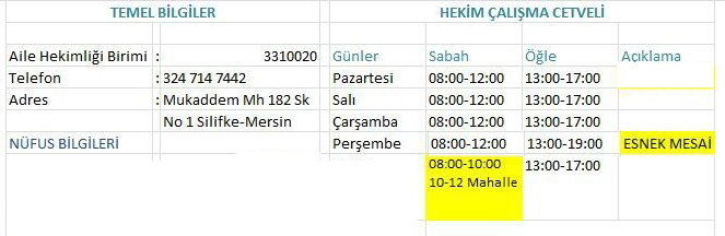 3310020 Nolu AHB de görev yapan Dr. Ahmet Kilisli, hemşire Ayşegül Büyük ile birlikte hizmet vermektedir. Her perşembe günü esnek mesaisi vardır. Gezici mobil hizmeti yoktur.