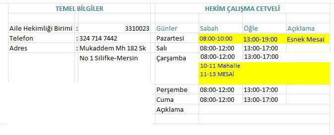 3310023 Nolu AHB de görev yapan Uz. Dr. Ayşe Kulakcı, Ebe Songül Kılıç'la birlikte hizmet vermektedir. Her pazartesi günü esnek mesaisi vardır. Gezici mobil hizmeti yoktur.