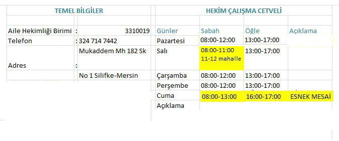 3310019 Nolu Aile Hekimliği Biriminde aile hekimliği biriminde Uz.Dr. Kağan Kunt , Hemşire Hatice Gök Bolaç'la birlikte hizmet vermektedir. Esnek mesai günü Cuma günüdür.